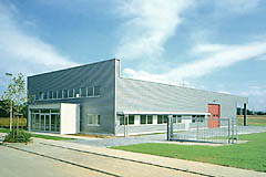 Der zweigeschossige Kopf des Gebäudes beinhaltet Verwaltung und Empfang. Im Anschluß an die Fertigungshalle gibt es einen überdachten Lagerbereich, der für eine zukünftige Erweiterung der Halle genutzt werden kann.
