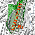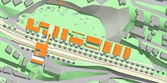 Der Schwerpunkt liegt gegenüber dem Bahnhof - hier wird eine öffentliche Plaza mit Büros und Café gebildet, auch Dientleistungen sind möglich - angegliedert ist ein seniorengerechter Wohnkomplex.