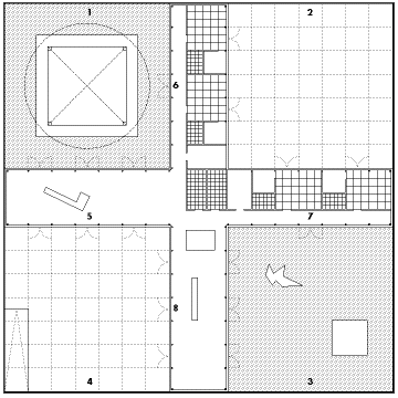 1 Turmhof 2 Werkhof Ateliers 3 Skulpturenhof 4 Eingangshof, Cafeterrasse 5 Cafe, Ausstellung 6 Ateliers 7 Ateliers 8 Cafe |