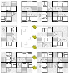 "Die städtebauliche Idee stellt sich als ein autonomes Implantat innerhalb der vorhandenen Bausubstanz dar. ... bietet das Konzept eine ruhige, familienfreundliche Atmosphäre und läßt eine hohe Wohnqualität erwarten.
