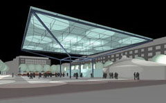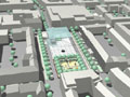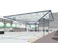 Hierfür wird ein großes Glasdach als transparenter Regenschirm vorgeschlagen, das auf einer Fläche von 36mx36m witterungsgeschützt vielfältige Aktivitäten ermöglicht (Marktplatz, Musik, Theater etc). |