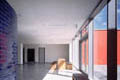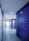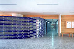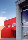 Die Kombination der materialeigenen Farben mit roten und blauen Akzenten erzeugt eine freundliche Atmosphäre; die Gestaltung erleichtert auch die Orientierung im Gebäude.