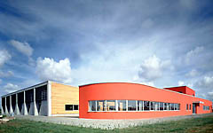 Die Struktur des Gebäudes ist klar gegliedert : Zwei Bauteile - Werkstätten einerseits und Bereiche für Gymnastik sowie Speisesaal und Küche andererseits - sind durch ein gemeinsames Foyer verbunden. Einschnitte in die Gebäudetiefe lassen hier einen großzügigen Eingangsbereich sowie einen Gartenhof entstehen.